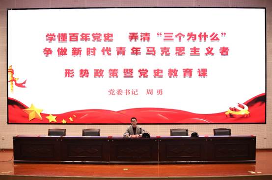 为深入学习贯彻习近平新时代中国特色社会主义思想和党的十九届五中全会精神,落实《中长期青年发展规划》以及《关于深入实施青年马克思主义者培养工程的意见》相关要求,着力为党培养和输送青年政治骨干,4月29日,学校团委在雪峰校区学术交流中心报告厅举办2021年青年马克思主义者培养工程培训班。党委书记周勇,党委委员、副院长刘凯,党委委员、宣传统战部部长吕强以及党委学生工作部、马克思主义学院负责人,全体团委委员和100名“青马工程”培训班学员参加开班典礼。开班典礼上,周勇为培训班作了以“学懂百年党史,弄清‘三个为什么’,争做新时代青年马克思主义者”为题的形势政策及党史教育课。